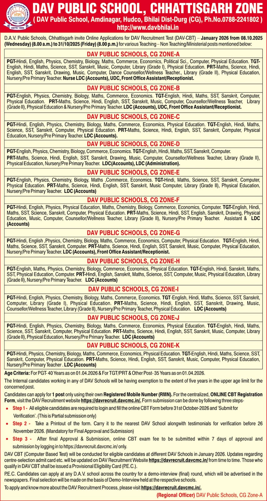 Vacancy for Teachers and Staff Session 2026-27 CG-Zone-E Korba